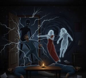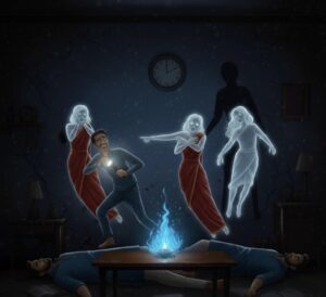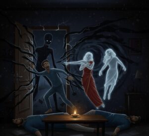 बस दिया जलता रहा और हिला नहीं, पर उन दोनों ने जब सामने देखा तो बस दो पैर घुटने तक दिख रहे थे, वो भी उल्टे। कुछ ही सेकंड में वो दोनों पैर भी गायब हो गए। सविता ने बोला, “रवि, कुछ भी हो जाए बस हमें दिए को बुझने नहीं देना है।” तभी उनके कमरे में से एक आवाज़ आई, (“लो, तुमने मुझे बुलाया था ना इसलिए मैं तुम लोगों के पास आ गई।”)। अब दिए के दूसरी तरफ़ एक कोई अजीब सा चेहरा दिखने लगा— उसके लंबे काले बाल, सफ़ेद आँखें और होंठ एकदम नीले
