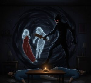 पंडित जी की चेतावनी को नज़रअंदाज़ करने और केवल एक दिया जलाने की वजह से, रवि और सविता ने अनजाने में ‘अँधेरे की देवी’ को अपने घर में बुला लिया था । उस भयानक परछाईं ने उनकी आत्माओं को कीच  लिया, और उनकी लाशें उसी अँधेरे कमरे में पड़ी रह गईं, जिसे वे बुरी आत्माओं से बचाना चाहते थे।