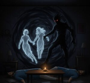 तभी दीवार हिलने लगी। सविता ने रवि का हाथ कसके पकड़ लिया और बोली रवि से कि हमें उसकी आँखों में नहीं देखना है। पर वो परछाईं एक झटके में उन दोनों के बिल्कुल करीब आ गई। इससे पहले वो दोनों कुछ कर पाते उस परछाईं ने उन दोनों की आत्मा को उन दोनों के शरीर से बाहरनिकाल लिया और उसी अंधेरे में ले के गायब हो गई और उन दोनों की लाश वहीं ज़मीन पे पड़ी रह गई।