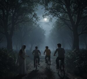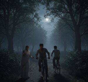 फिर वह धीरे-धीरे हमारे पास आई और फिर से वही सवाल पूछा, “कृपया मुझे लिफ्ट दे दो, मुझे घर जाना है।”मैंने दोस्तों से कहा, “अरे, यह शायद किसी गाँव से आई है, लिफ्ट दे देते हैं।” लेकिन किसी कारण से मेरे दोस्तों को डर लगने लगा। वे धीरे-धीरे साइकिल की गति तेज़ करने लगे।मैंने सोचा, “क्या फर्क पड़ता है? कुछ नहीं होगा।” और मैंने उसकी तरफ बढ़ते हुए कहा, “क्या आप किस दिशा में जा रही हैं?”वह जवाब नहीं देती, बस मुझे घूरने लगी। फिर उसने धीरे से कहा, “तुम्हारे पास साइकिल नहीं है, लेकिन मुझे लिफ्ट दे दो।”अचानक, उस औरत ने अपनी आँखें खोल दीं, और उनमें जो रक्त-लाल रंग था, वह मेरे दिल को डरा देने के लिए काफी था। मैंने एक पल के लिए उसे देखा, और मुझे समझ में आ गया कि कुछ ठीक नहीं था। मेरी नज़रें उसपर टिकी हुई थीं, लेकिन वह औरत नजदीक आकर हमारे साथ साइकिल पर चढ़ने का इशारा करने लगी।
