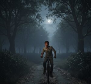 मैंने अब तक समझा नहीं था कि वह औरत कितनी अजीब थी। जैसे ही मैंने साइकिल रोकने का इरादा किया, मेरी आँखों के सामने उसे एक अजीब-सी मुस्कान दी। उसका चेहरा पूरी तरह से बदल चुका था, उसकी आँखें अब पूरी तरह से लाल हो चुकी थीं, और उसके मुंह से झाग निकल रहा था। यह देख मैं दंग रह गया।अचानक उस औरत ने मेरे कंधे को पकड़ लिया और झटके से खींच लिया। मुझे एक जोर का झटका लगा, और मैं गिर पड़ा। मेरी साइकिल जमीन पर गिर गई, और मैं थोड़ी देर के लिए बेहोश हो गया।जैसे ही मेरी आँखें खुलीं, वह औरत वहां नहीं थी। लेकिन मेरी साइकिल उधर-उधर बिखरी पड़ी थी। मुझे समझ में नहीं आ रहा था कि यह क्या हो रहा है। मुझे डर लगने लगा, और मैंने जल्दी से साइकिल उठाई और घर की ओर दौड़ने लगा।मेरे दिल की धड़कन इतनी तेज़ थी कि मैं सोच भी नहीं सकता था