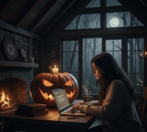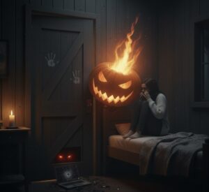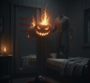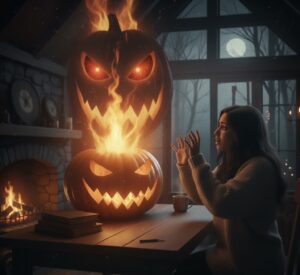 हैलोवीन के त्योहार की रात की बात है, एक एकांत कॉटेज में आराध्या नाम की लेखिका अकेले बैठ कर अपनी न्यू हॉरर स्टोरी लिख रही थी। बस वहाँ रोशनी के लिए ख़ाली एक छोटी सी चिमनी का ही सहारा था। आराध्या अपने लैपटॉप में बहुत ध्यान से अपनी हॉरर स्टोरी लिख रही थी, पर फिर भी उसके मन में अजीब तरीके की बेचैनी सी थी। तभी उसने अपनी मेज पे एक बड़ा सा कद्दू रख दिया जो उसे अपने कॉटेज के पीछे वाले जंगल से मिला था। पहली बात तो ये कि कद्दू और कद्दू से बहुत बड़ा था और दूसरी बात, उस कद्दू पे एक अजीब सी डरावनी सी मुस्कान बनी हुई थी।