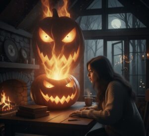 रोशनी ज़्यादा करने के लिए उसने एक मोमबत्ती उस कद्दू के अंदर लगा दी। तभी एकदम से उसके कॉटेज की खिड़की में खड़खड़ की आवाज़ हुई। उसने खिड़की की तरफ़ देखा तो उस खिड़की का लॉक ख़ुद ही हिल रहा था। तभी उसकी नज़र दुबारा से उसी मेज़ पर गई तो वो मोमबत्तीजो उसने उस कद्दू पे जलाई थी, बहुत तेज़ी से जलने लगी। उस मोमबत्ती की रोशनी इतनी तेज़ हो गई कि उस कद्दू की मुस्कान में से नारंगी रंग की रोशनी आने लगी। आराध्या कुर्सी से खड़ी हुई और उस मोमबत्ती को बुझाने लगी। जैसे ही वो उस कद्दू के और करीब गई,