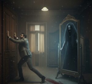 उसके पैर खुद-ब-खुद आईने की तरफ जा रहे थे। वो चिल्ला रहा था, “बचाओ रवि… मुझे वो औरत खींच रही है…”रवि ने अजय को पकड़ने की कोशिश की, लेकिन जैसे ही रवि ने हाथ बढ़ाया, उसका हाथ आईने में घुस गया। शीशे के अंदर ठंडा अँधेरा था, और उसमें से कई हाथ बाहर निकलने लगे।अजय की चीख़ धीरे-धीरे रुक गई। उसका पूरा शरीर शीशे के अंदर समा गया और वहाँ सिर्फ खून की एक हल्की सी लकीर बची रह गई।रवि डर से पागल हो गया। वो दरवाज़े पर ज़ोर-ज़ोर से घूँसे मारने लगा।