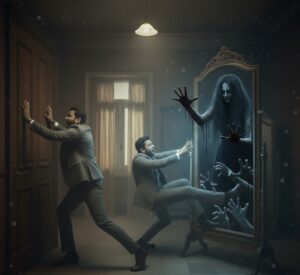 “मुझे जाने दो… कोई है… दरवाज़ा खोलो!” लेकिन दरवाज़ा नहीं खुला।शीशे पर अब एक और शब्द लिखा था: “अब तुम्हारी बारी है।”कमरे में अचानक और अँधेरा बढ़ गया। शीशे से वही औरत बाहर निकल आई। उसके लंबे बाल ज़मीन तक लटक रहे थे, चेहरा अभी भी ढका था। वो धीरे-धीरे रवि की तरफ बढ़ी।रवि पीछे हटता गया, लेकिन उसके पीछे दीवार थी। उसके पास भागने का कोई रास्ता नहीं था। औरत ने धीरे से अपना चेहरा उठाया।वो चेहरा इंसानों जैसा नहीं था। खाली आँखों के गड्ढे, सड़ी हुई त्वचा और एक विकृत मुस्कान।रवि चीख़ते हुए बेहोश हो गया।