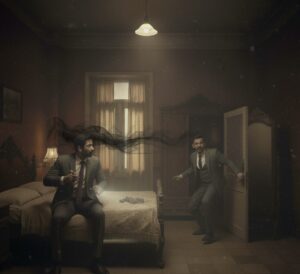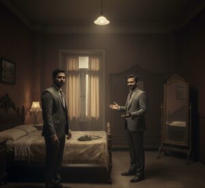 पर वो काफी दूर से आती सुनाई दे रही थी। दोनों ने डरते-डरते अपनी नज़र कमरे के चारों तरफ़ घुमाई, लेकिन कोई भी नहीं था।अब उस शीशे के सामने एक औरत की परछाई आकर खड़ी हो गई। उसका चेहरा अँधेरे से ढका हुआ था और हाथ ख़ून से सने हुए थे। वो धीरे-धीरे मुस्कुराते हुए बोली, “तुम्हारी तरह यहाँ बहुत आए, पर कोई भी वापस नहीं गया।”रवि और अजयउस बिस्तर से पीछे हट गए। डर के मारे अजय ने अपनी आँखें बंद कर ली और चिल्लाने लगा। रवि ने अजय की तरफ देखा तो वो औरत उसको उस शीशे के अंदर खींच रही थी।