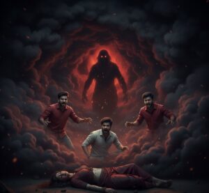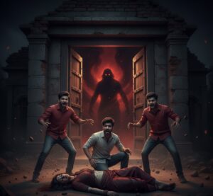 पता नहीं लोग बिना बात के फ़ालतू में डरते रहते हैं।” तभी बोनफायर बुझ गया और सारे लोग अपने-अपने घर में चले गए। अब हर जगह सिर्फ़ सन्नाटा ही सन्नाटा। बस घर के बाहर तीन दोस्त – विक्रम, आरव और राजन – उन तीनों ने मिलकर एक योजना बनाई कि चलो आज हम तीनों उस पुराने खंडहर मंदिर के अंदर चलते हैं। अब वह तीनों दोस्त मंदिर के पास तक पहुँच गए थे, पर उन तीनों ने देखा कि मंदिर के दरवाज़े पर कोई इंसान खड़ा है जो दिखने में लम्बा और पतला सा है और उसका चेहरा लम्बे बालों से ढका हुआ था और वह काले रंग की फटी चादर पहने हुआ था।