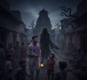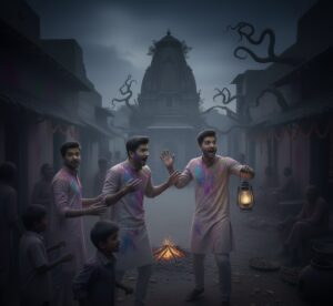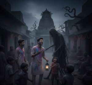 वह इंसान ऐसा लग रहा था जैसे कि उसे पता हो कि वह तीनों यहाँ आने वाले हैं। आरव ने बोला, “यार विक्रम, यह कोई है।” विक्रम तो कुछ नहीं बोला पर राजन ने बोला, “अरे कोई शराबी होगा। होली का टाइम है न, तो नशे में यहाँ आके खड़ा हो गया होगा। तुम लोग उसपे ध्यान न दो, चलो हम आगे चलते हैं।” जैसे ही वह तीनों आगे बढ़े, तभी वह लम्बे बाल वाला इंसान बोला, एक भयानक आवाज़ में, “आज की रात इस गाँव का अंतहोगा।” राजन हँसने लगा और बोला, “लगता है कुछ ज़्यादा ही पी ली है तुमने जो उल्टा-सीधा बोलने लग रहे हो।