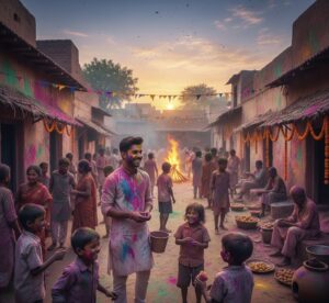 में व्यस्त हो रखे थे। बच्चे अलग-अलग रंग के गुब्बारों और रंगों से खेल रहे थे। और बड़े लोग कोई घर सजाने में व्यस्त था तो कोई होली के लिए पकवान। होली के त्योहार के कारण गाँव में एक ख़ुशी का माहौल था। एक जवान लड़का जिसका नाम राजन था, वह कुछ दिनों पहले ही बाहर शहर से अपने गाँव वापस आया था। अपने पुराने बचपन के दोस्तों से मिलने और इस बार उसने सोचा कि इस साल की होली गाँव में मनाऊँगा, तो यह सोचकर खुश था। जैसे ही शाम होती गई, पूरे मौसम मेंकुछ अलग सा एहसास सा लगने लगा।