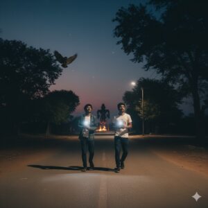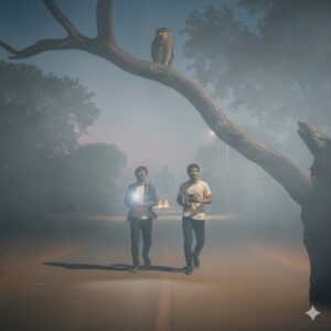 हस्ते बात करते आ रहा थे जो वो दुशहरा मेला देख के आए थे उसके बारे मैं,है विशाल तुम कहा तो सही ही रहे हो पर चलो अब घर चलता  है क्यूँकि“रात भी बहुत होगी है और रोड भी ख़ाली है और अँधेरा मैं डर भी लगता है फिर दोनों ना अपना फ़ोन निकाल लिया मोबाइल कि फ़्लैश लाइट जलने के लिए उसकी लाइट की मदद से वो आगे चलते रहे चलते चलते उनकी सासे भी तेज तेज चल रही थी , और ख़ाली रास्ते मैं कदमों की भी आ रही थी ।उसी रास्ते मैं काफ़ी बड़े बड़े पड़े भी थे और काफ़ी झाड़िया  भी फली भी थी जिसे देखते ही एक डर सा महसूस हो रहा था | जब विशाल और सूरज चल रहे थे तो उन्हें एक डैम सा उल्लू की चिल्लाने