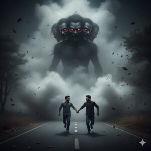 दौड़ते दौड़ते आख़िरकार दोनों सड़क तक पोछने वाले ही थे उनके सामने फिर वही कोहरा आने लगा पर अब कोहरा तो था उसके सात राख भी उड़ने लगी उन दोनों को ये नहीं समज आ रहता आख़िर या सब कहा से आ रहे है । अब इतना वो समझते की या सब कहा से और कैसे हो रहा है इतने मैं उस राख मैं से ही एक परछाई धीरा धीरा आने लगी ।विशाल और सूरज ने जब यह चीज सच मूछ अपनी आखों से देखी तो वो डर के मारे पसीने पसीने होगए । क्यूँकि अब वो परछाई किसी पैड की तो थी न्ही और ना ही उन दोनों मैं से किसी की थी बल्की किसी दस सर वाली चीज की थी उस चीज के दस के दस चेहरे बहुत ही डरावने थे और जो