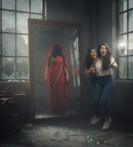 रिया वो देख शायद उस पोस्टर मैं लाल साड़ी हिल रही थी । रिया ने मोबाइल की फ़्लैशलाइट से देखा पर कुछ भी न्ही था । शायद किसी चीज की परछाई होगी छोड़ भी ,पर अब वो खुद भी डर चुकी थी । फिर दुबारा से वो दोनों आगे बड़े थोड़ा आगे चले तो उन्हें टूटा वा शीशा मिला ,तो रिया ने बोला शीशा देख कि तो लगता है की या उसी लाल सारी वाली का होगा , रिया बोली अगर डर न्ही लगता तो या लाइन कैमरा मैं बोल ,तन्वी भी मुस्कराती हुए बोली अरे डर नहीं आगे वो कुछ बोल पाती तभी शीशे के पीछे उस कोई खड़ा मिला ऐसा लग रहा था जैसे वही औरत हो क्युकी वो भी लाल साड़ी मैं थी बालों से चहरा ढक्कावा था । रिया जोर से चिल्लाती भी बोली रिया जल्दी पीछा हाट