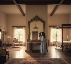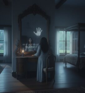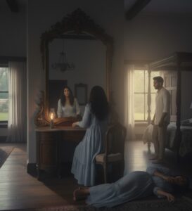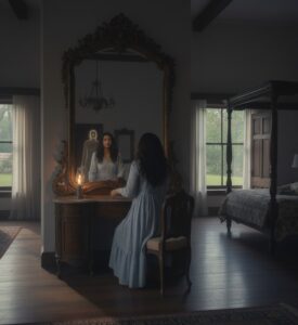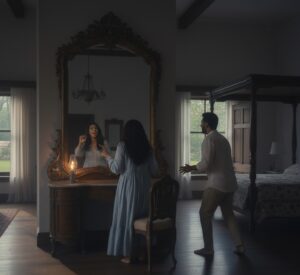 नेहा बोली मैं अभी अभी अपने आप को शीशे कि सामने पालक झपकते हुए देखा जबकि मैं पलक ही ननहीं हिलाई ।रोहन ने उससे पानी दिया और बोला तुम कुछ जधा ही इस शीशे के सामने बैठ कर कुछ सोच रही होगी इसलिए तुमे ऐसे लगा होगा , रोहन बोला चलो सोने चलते है नेहा ने खाली गर्दन हिलाई और उसके साथ सोने चलेगई लेकिन अंदर से नेहा को महसूस हो रहा था की वह पे कुछ तो था मुझे ऐसे धोका तो न्ही हो सकता । फिर से अगली रात जब नेहा अकेली थी तो उसने सोचा आज फिर देखती हूँ की वो सच था यह फिर मेरा भरम , नेहा फिर से उसी शीशे के पास जाके बेठ गई ।